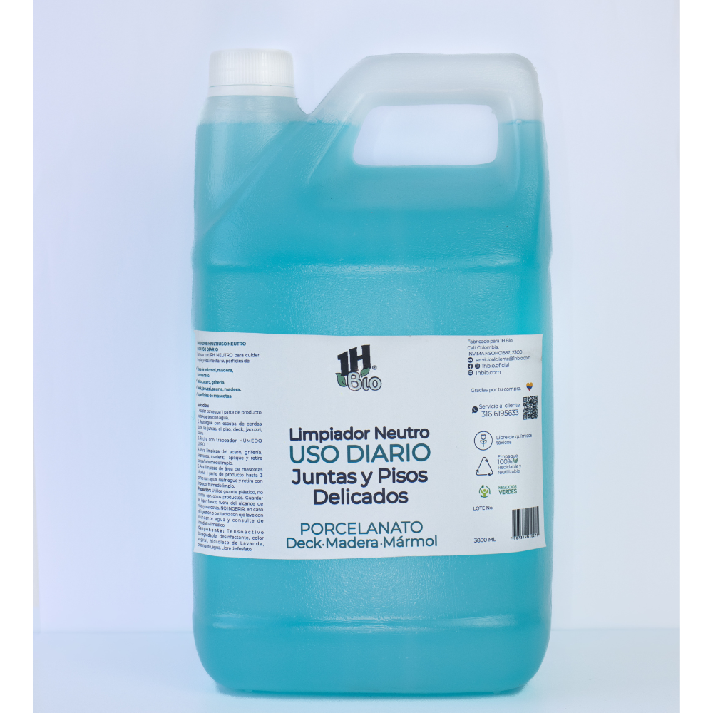 1H Bio, limpiador neutro especializado para limpiar pisos y juntas. De uso diario para porcelanato, cerámica, mármol, madera natural y madera plástica. Desinfecta y limpia la zona húmeda, como baños, jacuzzi y sauna; además, elimina el mal olor de los espacios donde habitan los animalitos o peluditos.